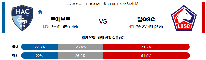 12월01일 르아브르:릴OSC 리그앙 분석 및 예측 스포츠중계:스포츠무료중계