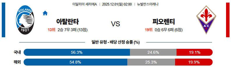 12월01일 아탈란타:피오렌티나 세리에A 분석 및 예측 스포츠중계:스포츠무료중계