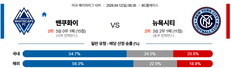 04월12일 밴쿠버:뉴욕시티 MLS 분석 및 예측 스포츠중계:스포츠무료중계