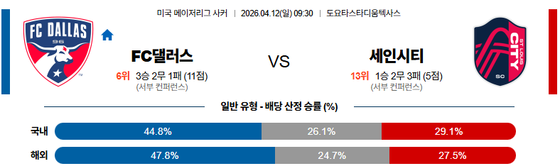 04월12일 세인트루이스:댈러스 MLS 분석 및 예측 스포츠중계:스포츠무료중계