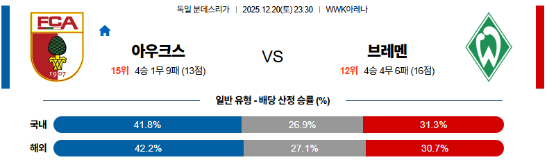 12월20일 아우크스부르크:브레멘 분데스리가 분석 및 예측 스포츠중계:스포츠무료중계
