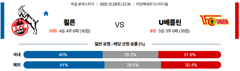 12월20일 쾰른:우니온베를린 분데스리가 분석 및 예측 스포츠중계:스포츠무료중계