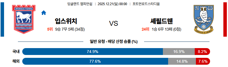 12월21일 입스위치:셰필드웬즈데이 잉글랜드챔피언쉽 분석 및 예측 스포츠중계:스포츠무료중계