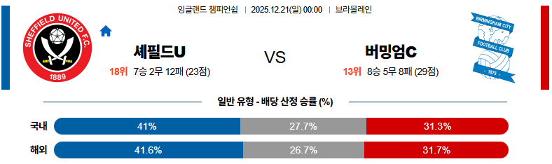 12월21일 셰필드유나이티드:버밍엄시티 잉글랜드챔피언쉽 분석 및 예측 스포츠중계:스포츠무료중계