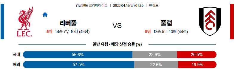 04월12일 리버풀:풀럼 프리미어리그 분석 및 예측 스포츠중계:스포츠무료중계