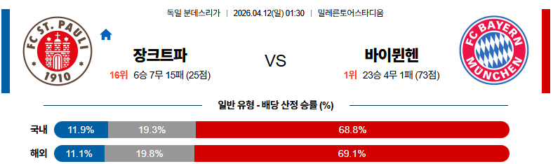 04월12일 뮌헨:장크트파울리 분데스리가 분석 및 예측 스포츠중계:스포츠무료중계