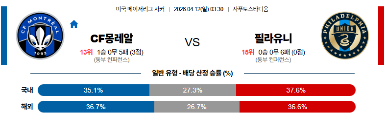 현재 04월12일 몽레알:필라델피아 MLS 분석 및 예측 스포츠중계:스포츠무료중계