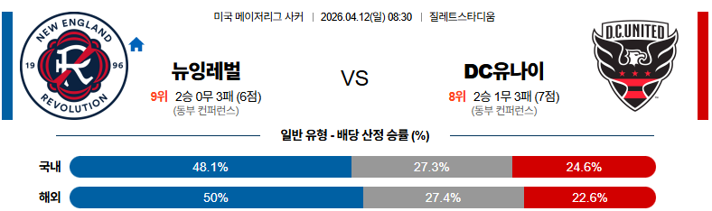 04월12일 뉴잉글랜드:DC유나이티드 MLS 분석 및 예측 스포츠중계:스포츠무료중계