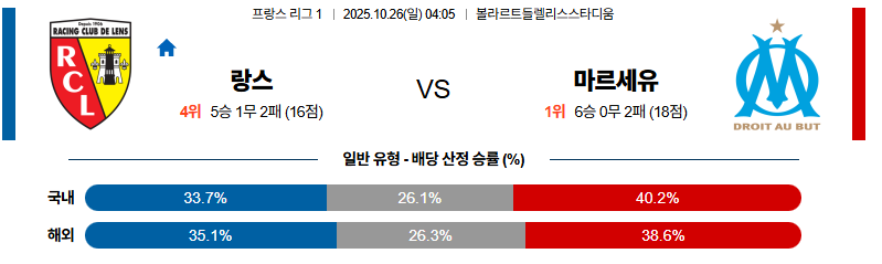 랑스는 전환 속도와 침투 타이밍이 완벽히 맞물리며, 마르세유의 느린 세컨드 라인 대응을 효과적으로 공략할 가능성이 높습니다. 반면 마르세유는 후방 밸런스가 무너지는 순간, 박스 안 혼전에서 실점으로 이어질 여지가 큽니다. 결국 이 경기는 랑스의 속도전이 경기 흐름을 지배할 것입니다.