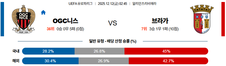 이 경기는 브라가의 불안한 후방 빌드업과 니스의 조직적인 압박이 충돌하는 구도로, 니스가 상대의 실수를 유도할 가능성이 높습니다.
