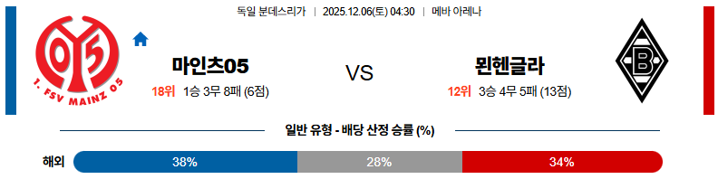 마인츠 대 묀헨글라트바흐 분데스리가 12월06일 맞대결 생중계, 스포츠중계, 스포츠분석