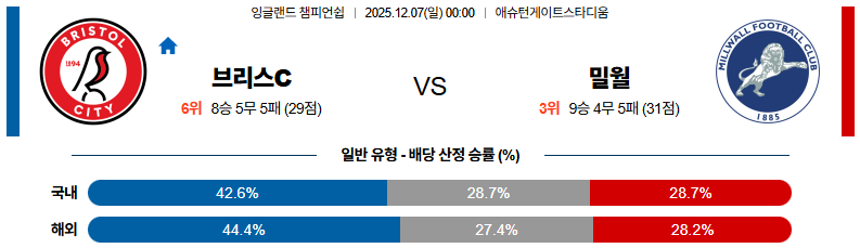브리스톨 대 밀월 잉글랜드챔피언쉽 12월07일 맞대결 생중계, 스포츠중계, 스포츠분석