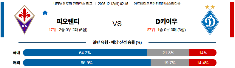 현재 디나모키이우 대 피오렌티나 UEFA유로파컨퍼런스 12월12일 맞대결 생중계, 스포츠중계, 스포츠분석