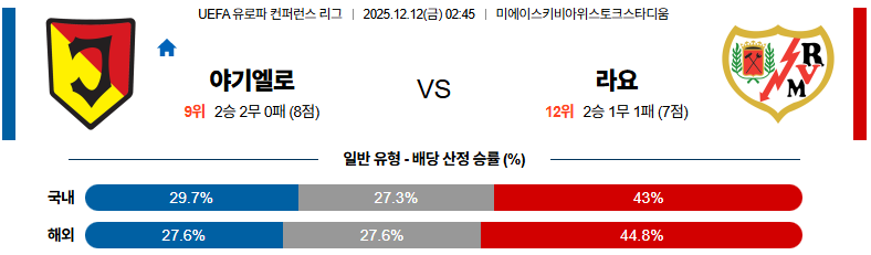 야기엘로니아 대 라요 UEFA유로파컨퍼런스 12월12일 맞대결 생중계, 스포츠중계, 스포츠분석