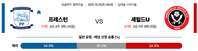 프레스턴 대 셰필드유나이티드 잉글랜드챔피언쉽 10월25일 맞대결 생중계, 스포츠중계, 스포츠분석