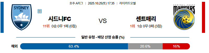 현재 시드니FC 대 센트럴코스트 호주A리그 10월25일 맞대결 생중계, 스포츠중계, 스포츠분석