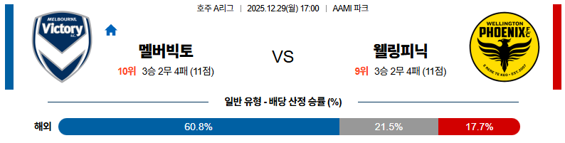 12월29일 멜버른빅토리:웰링턴피닉스 호주A리그 분석 및 예측 스포츠중계:스포츠무료중계