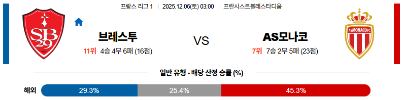 스타드브레스트 대 AS모나코 리그앙 12월06일 맞대결 생중계, 스포츠중계, 스포츠분석
