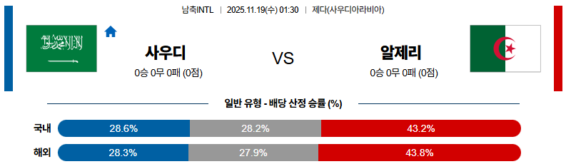 11월19일 사우디아라비아:알제리 남축INTL 분석 및 예측 스포츠중계:스포츠무료중계