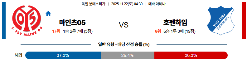 11월22일 마인츠:호펜하임 분데스리가 분석 및 예측 스포츠중계:스포츠무료중계