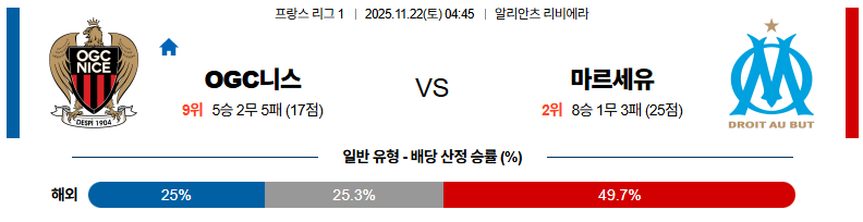 11월22일 OGC:마르세유 리그앙 분석 및 예측 스포츠중계:스포츠무료중계