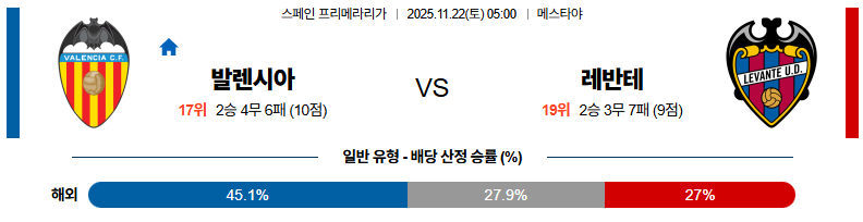 현재 11월22일 발렌시아:레반테 라리가 분석 및 예측 스포츠중계:스포츠무료중계