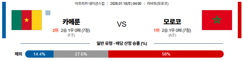 01월10일 카메룬:모로코 네이션스컵 분석 및 예측 스포츠중계:스포츠무료중계