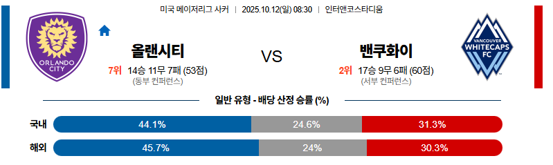 올랜도시티는 인버티드 패턴과 빠른 전환으로 상대의 포백을 흔들 준비가 되어 있습니다. 벤쿠버는 체력 부담과 수비 간격 관리 실패로 경기 후반 집중력 저하가 불가피할 것입니다. 공간 활용 능력과 공격 전개 완성도에서 한 단계 앞선 올랜도가 홈에서 승리를 가져갈 가능성이 높습니다.