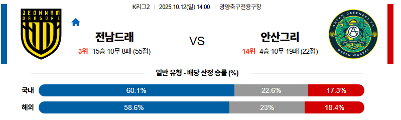전남은 안정된 파이브백을 기반으로 역습 완성도를 극대화하며, 경기 전체 리듬을 자신들의 템포로 이끌 가능성이 높습니다. 안산은 전개 속도는 빠르지만 세밀한 조율이 부족하고, 역습 대응에서 조직적 공백이 드러날 위험이 있습니다. 알베르띠의 킬패스 한 방과 호난의 속도, 발디비아의 연계가 결합될 때 전남은 승부를 결정지을 수 있는 경기력을 보여줄 것입니다.
