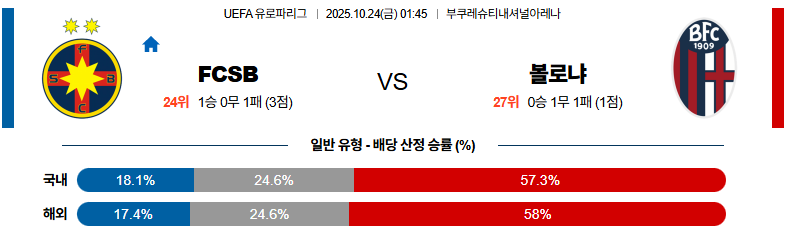슈테아우아부쿠레슈티 대 볼로냐 UEFA유로파리그 10월24일 맞대결 생중계, 스포츠중계, 스포츠분석