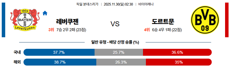 11월30일 레버쿠젠:도르트문트 분데스리가 분석 및 예측 스포츠중계:스포츠무료중계