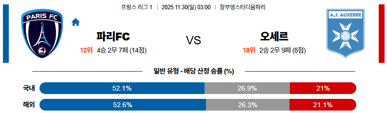 11월30일 파리FC:AJ오세르 리그앙 분석 및 예측 스포츠중계:스포츠무료중계