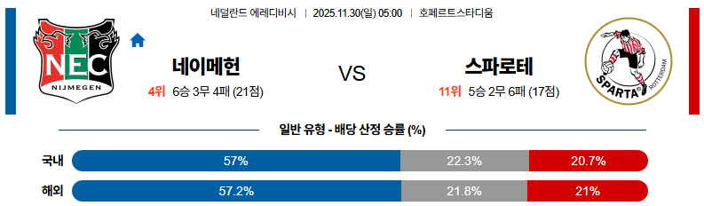 11월30일 네이메헌:스파르타로테르담 에레디비지 분석 및 예측 스포츠중계:스포츠무료중계