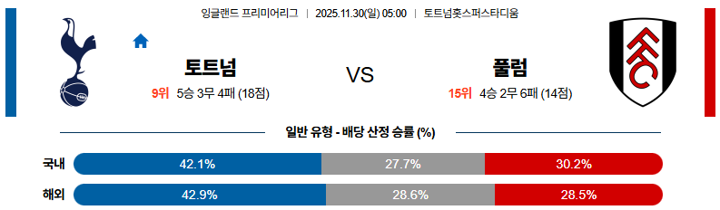 11월30일 토트넘:풀럼 프리미어리그 분석 및 예측 스포츠중계:스포츠무료중계