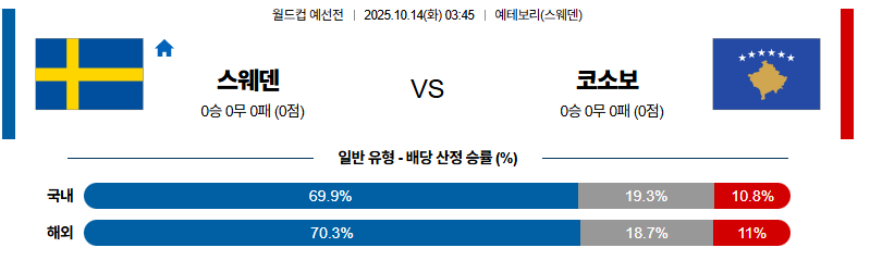 스웨덴은 중앙 전개 속도와 하프스페이스 활용 능력에서 완성도가 높습니다. 살레트로스의 전방 침투와 니그렌의 마무리 루트는 코소보의 쓰리백을 완전히 흔들 구도입니다. 반면 코소보는 전환 타이밍이 늦고, 중원과 수비 간격이 벌어지는 문제를 해결하지 못하고 있습니다. 결국 스웨덴이 점유율, 공간 활용, 득점 효율 세 가지 모두에서 우위를 점하며 경기의 주도권을 완벽히 잡을 가능성이 높습니다.
