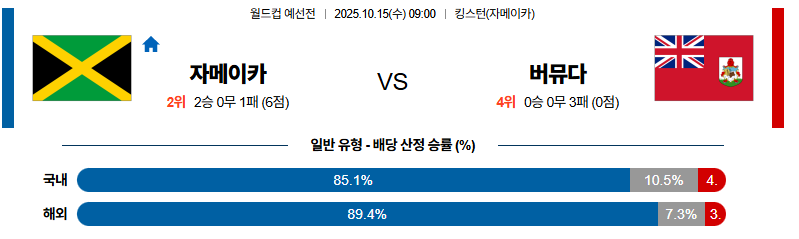 자메이카가 전반의 리듬을 이어가며, 후반 폭발력을 앞세워 승리를 완성할 가능성이 높습니다. 버뮤다가 체력적으로 지치면서 자메이카의 빠른 공격을 견디지 못할 것으로 보입니다.