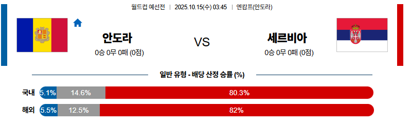안도라 (FIFA 랭킹: 150위 / 최근 5경기 1승 4패) 안도라는 4-4-2 전형으로 수비 라인을 촘촘히 세우며, 낮은 위치에서 블록을 형성합니다. 로드리고 타피아는 중원에서 볼 순환을 담당하지만, 압박이 강해질 경우 전진 패스가 막히고 템포가 쉽게 끊깁니다. 발레스는 전방에서 세컨드볼 압박을 시도하지만, 공격 전환 시 타이밍이 늦어 역습 효율이 떨어집니다. 가르시아는 후방에서 롱패스를 통해 빠른 전개를 노리지만, 정교함이 부족해 공격 연결이 부드럽지 못합니다. 특히 중앙 수비라인이 신체 조건에서 밀려 제공권 싸움에서 불리한 구도를 반복하고 있어, 세트피스나 크로스 상황에서 실점 위험이 높아집니다. 후반 구간에서 수비 집중력이 흔들리면 리스크는 커질 수밖에 없습니다.