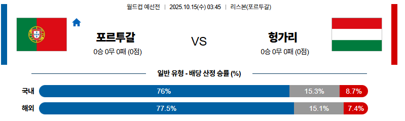 포르투갈은 전술 밸런스와 세트피스 완성도가 안정적이며, 브루노의 중원 조율과 콘세이상의 측면 돌파, 호날두의 결정력으로 경기를 마무리할 가능성이 높습니다. 헝가리는 수비 간격이 느슨하고 라인 유지가 불안정하여 장기적으로 버티기 어려운 구도입니다. 결국 점유율과 공간 활용의 완성도 차이로 포르투갈이 경기를 통제하며 승리를 거둘 것입니다.