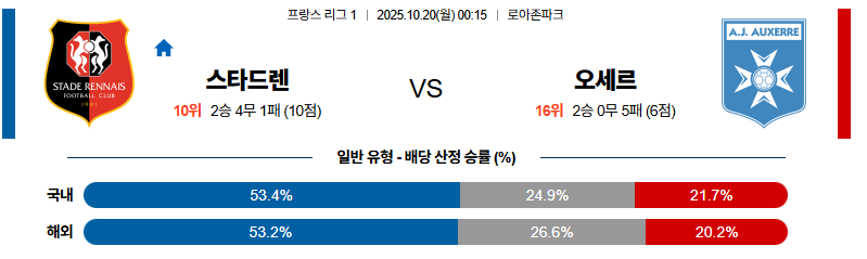 [FC LIVE] 스타드렌 대 오세르 리그앙 10월20일 맞대결 생중계, 스포츠중계, 스포츠분석
