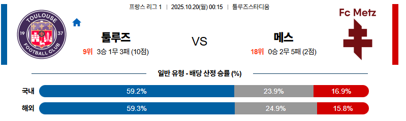 승격팀 메스는 여전히 수비 조직력에서 불안정함이 두드러지고 있습니다. 반면 툴루즈는 소우어와 마그리를 중심으로 전환 속도와 공격 완성도가 높아진 상태입니다. 이번 경기는 전술적 완성도와 체력 밸런스에서 확실한 우위를 점한 툴루즈가 홈에서 경기를 주도하며 승리로 이어갈 가능성이 높습니다. 리그 초반 상승세를 유지하기 위한 툴루즈의 집중력이 경기 전체를 지배할 것입니다.