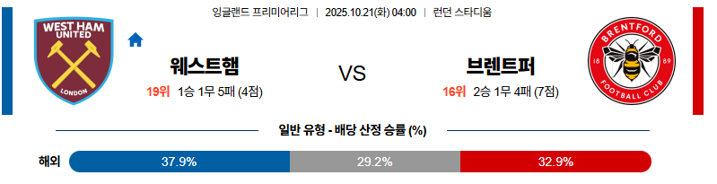 웨스트햄 대 브렌트퍼드 프리미어리그 10월21일 맞대결 생중계, 스포츠중계, 스포츠분석