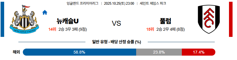 뉴캐슬은 일정 누적과 체력 저하로 인해 후반 집중력 유지가 어려운 상황입니다. 반면 풀럼은 이워비와 루키치를 중심으로 한 템포 유지가 정상 궤도에 올라 있으며, 이번 경기는 풀럼이 후반부 압박을 통해 경기의 흐름을 완전히 가져가며 원정에서도 승리를 만들어낼 가능성이 높습니다.