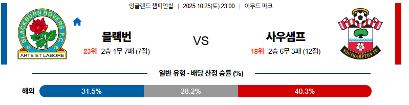블랙번 대 사우스햄튼 잉글랜드챔피언쉽 10월25일 맞대결 생중계, 스포츠중계, 스포츠분석