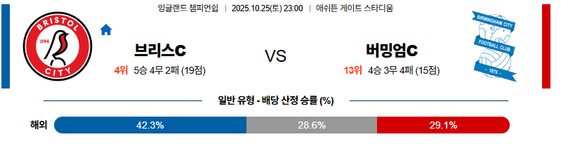 브리스톨 대 버밍엄시티 잉글랜드챔피언쉽 10월25일 맞대결 생중계, 스포츠중계, 스포츠분석