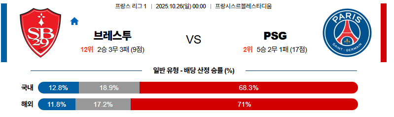 브레스트는 중원 간격 유지가 불안하고, 전환 템포에서 리그 상위권 팀들을 상대로 밀리는 모습이 자주 나타납니다. 반면 PSG는 바르콜라와 파비안 루이스의 전진성 있는 플레이를 통해 공간을 유연하게 공략할 수 있습니다. 결국 경기 전체 리듬을 통제할 수 있는 PSG가 점유율, 결정력, 전환 속도에서 모두 우위를 점하며 승리로 이어질 가능성이 높습니다.
