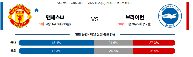 맨유 대 브라이튼 프리미어리그 10월26일 맞대결 생중계, 스포츠중계, 스포츠분석
