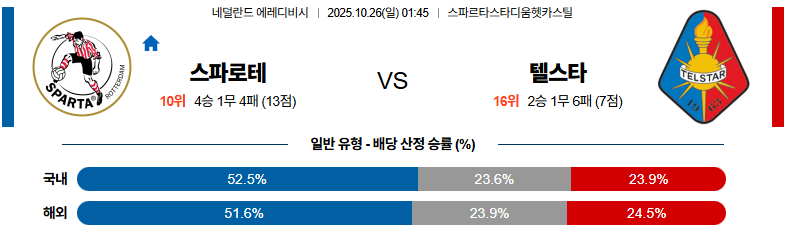 스파르타로테르담 대 텔스타 에레디비지에 10월26일 맞대결 생중계, 스포츠중계, 스포츠분석