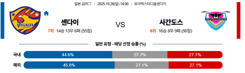 베갈타센다이 대 사간도스 J리그2 10월26일 맞대결 생중계, 스포츠중계, 스포츠분석