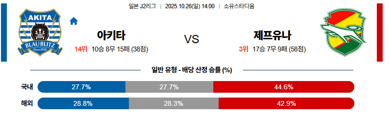 아키타 대 제프유나이티드 J리그2 10월26일 맞대결 생중계, 스포츠중계, 스포츠분석