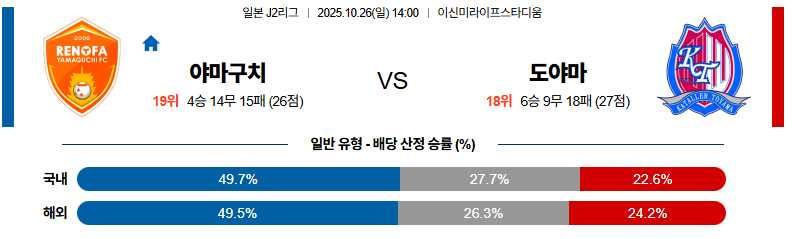 야마구치 대 도야마 J리그2 10월26일 맞대결 생중계, 스포츠중계, 스포츠분석